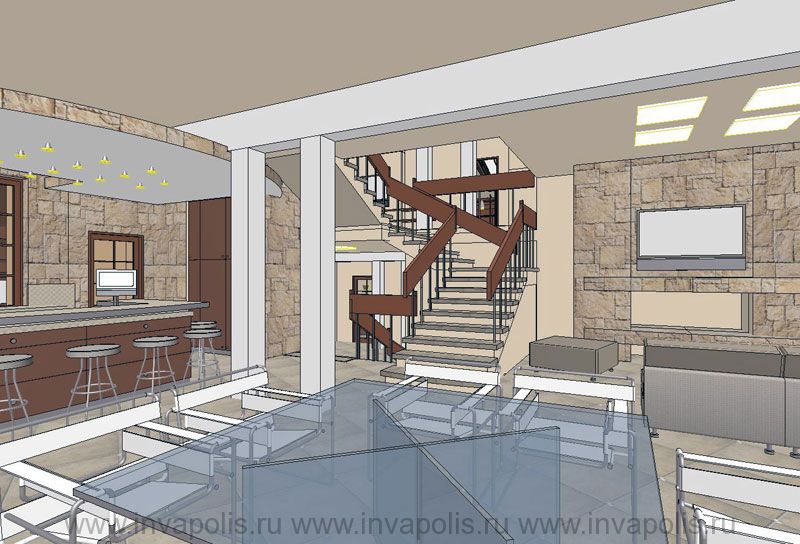 Холл нулевого уровня дома, вид на спуск в цокольный уровень и подъем на первый уровень