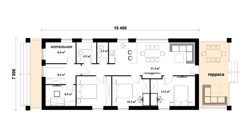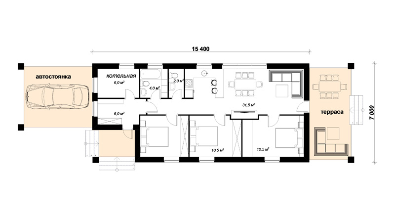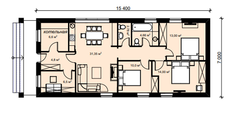 АНТУРИУМ узкий одноэтажный коттедж с габаритами 7х15.4 м подходит для строительства на узких участках, а тккже на длинных участках нормальной ширины.