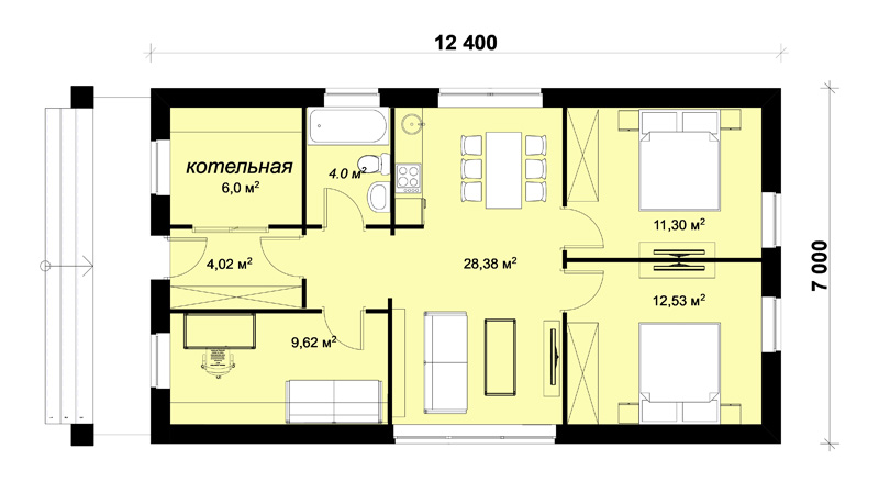 • ЛОТОС - проект одноэтажного узкого коттеджа шириной 7м, с мини-банькой, спальней и площадью 60.0 м2.