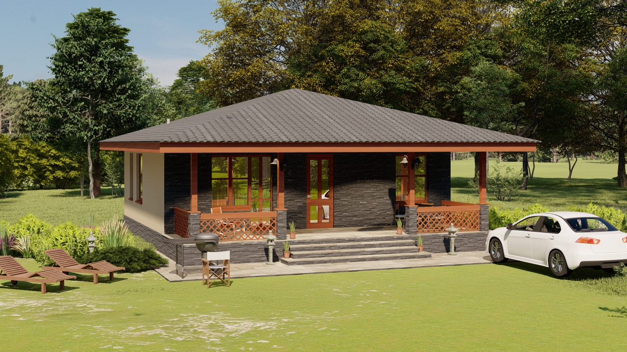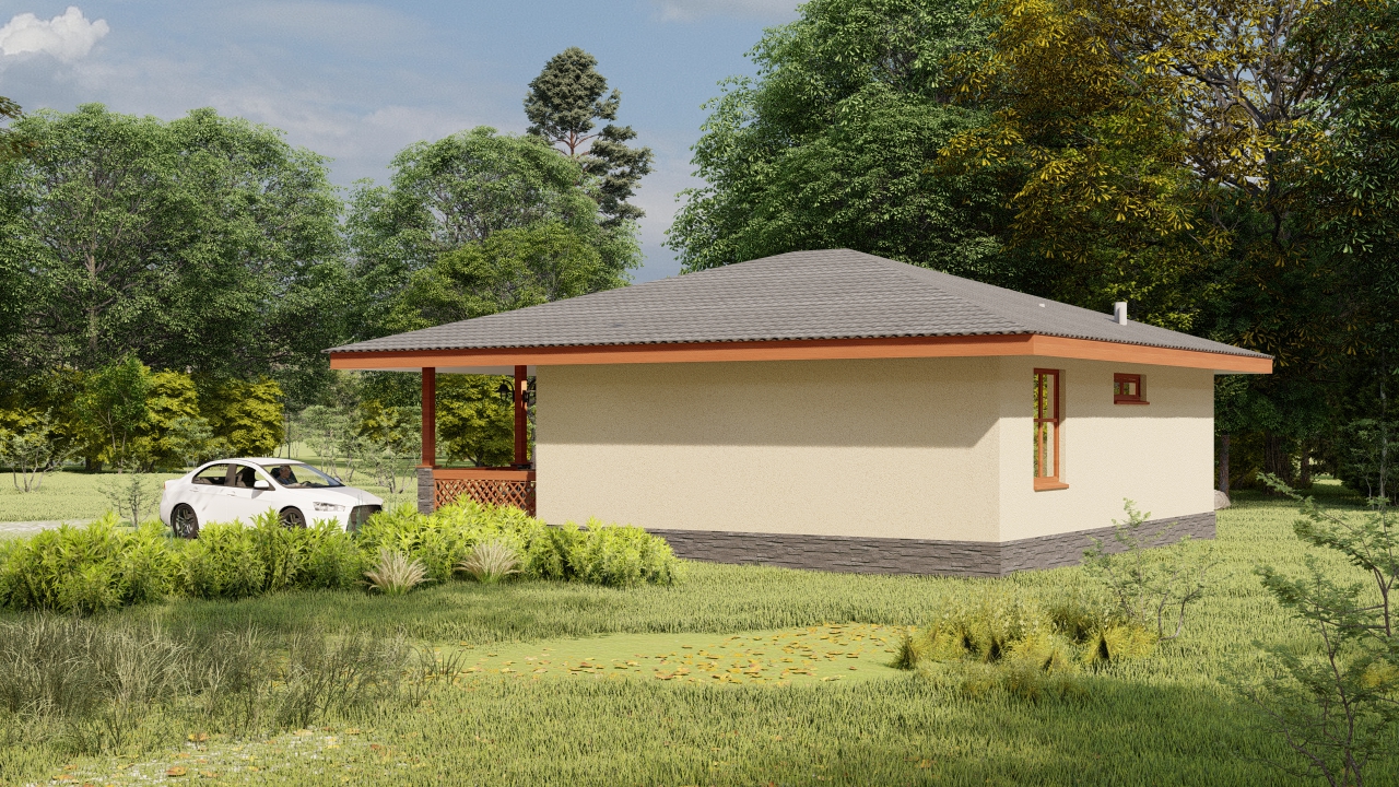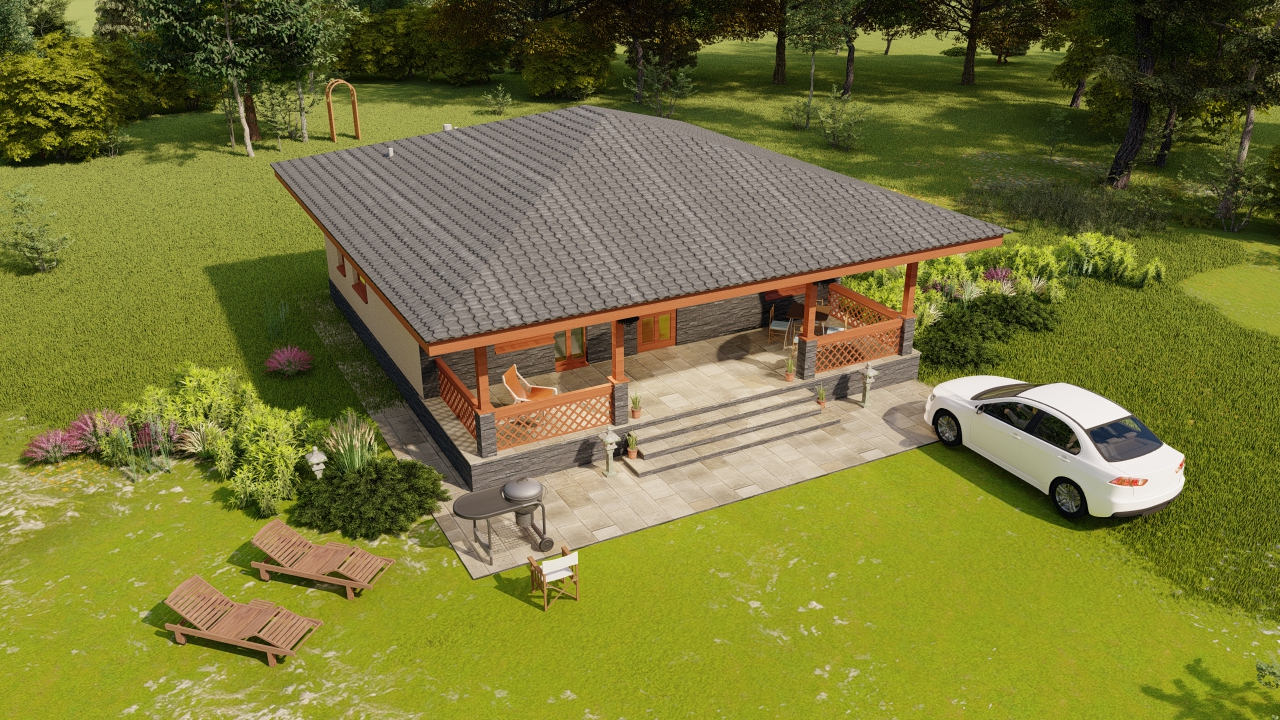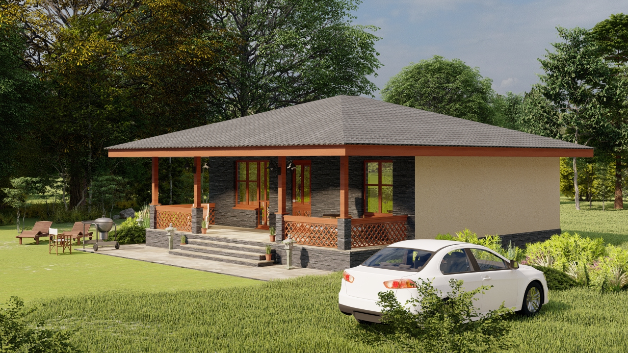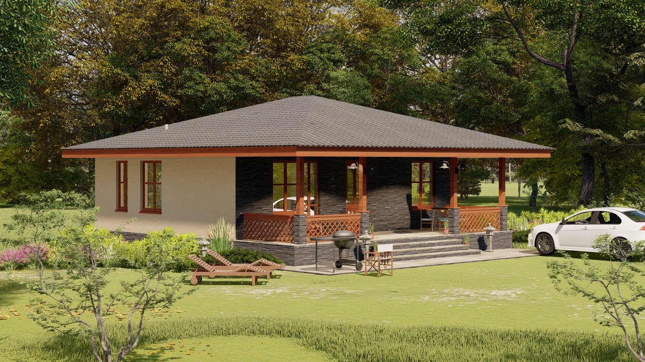 Проект маленького уютного одноэтажного дома с 2 спальнями и террасой во всю ширину дома, для строительства в конце участка