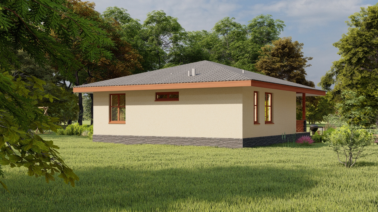 Дом в плане прямоугольный, без эркеров и выступов, что удешевляет строительство. «Коробка» выполняется из доступных и недорогих материалов, а технология строительства не требует применения тяжёлой техники.