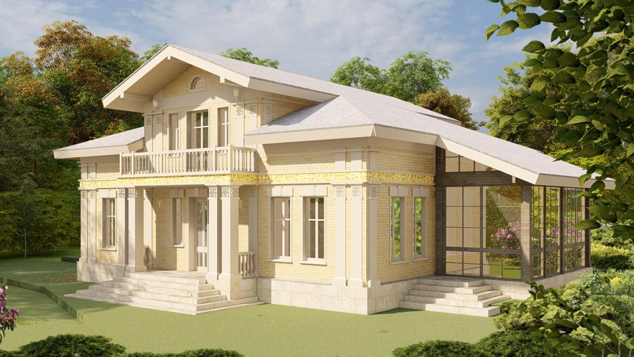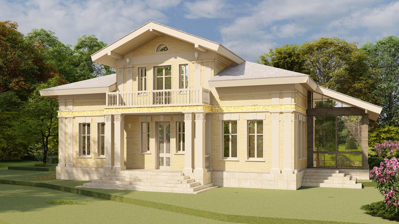 В отделке стен использован кирпич, изразцовый пояс и ПВХ детали (лепнина), деревянные элементы поддержки кровли, облицованная натуральным светлым камнем цокольная часть и низ колонн. Терраса выполнена контрастной к цвету дома, из темного дерева.